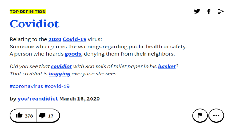 Urbani rječnik je "skovao" termin "kovidiot" koji se odnosi na sve one koji se susprostavljaju zdravstvenimm savjetima usljed pandemije korona virusa.