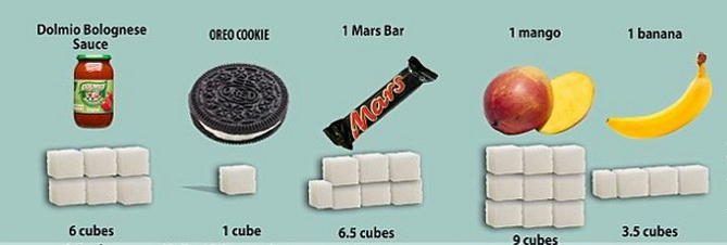Zanimljivo je da se na grafikonu nalaze i mango (devet kocki), jabuka (4,5 kocke) i banana (3,5 kocke). Treba ipak napomenuti da su bijeli šećer i kukuruzni sirup koji se koriste kao dodaci u mnogim proizvodima daleko štetniji od fruktoze koja se nalazi u voću.