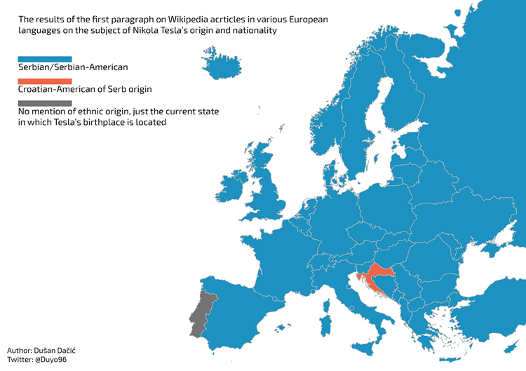Резултати првог пасуса Википедије на разним европским језицима на тему порекла и националности Николе Тесле.