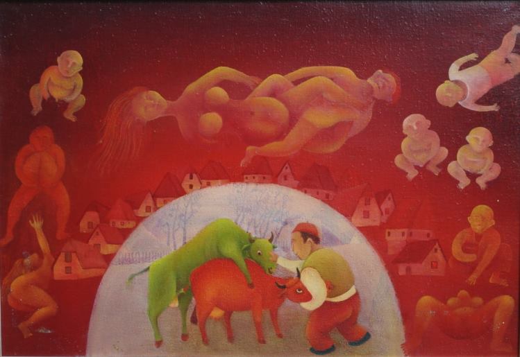 Mandić: Sad sam započeo sliku pod jednim, mogu reći, nazivom „Borba bikova“. To je kod nas još od ranijih vremena ustaljena tradicija da se posmatra borba bikova kada se oni bodu, jer u stvari, i naš veliki književnik Petar Kočić je u svojim pripovjetkama opisivao to, pa eto ja imam priliku da zapazim i da na slici kažem ono što je on kazao perom. Na drugoj slici, na primjer, slika „Obrezivanje“, to je jedan islamski stari običaj gdje se kod male djece vrši obrezivanje. Tako da je to isto mene inspirisalo da napravim sliku koja kazuje o nekim higijenskim običajima koju se još i dan-danas prisutni u Bosni.