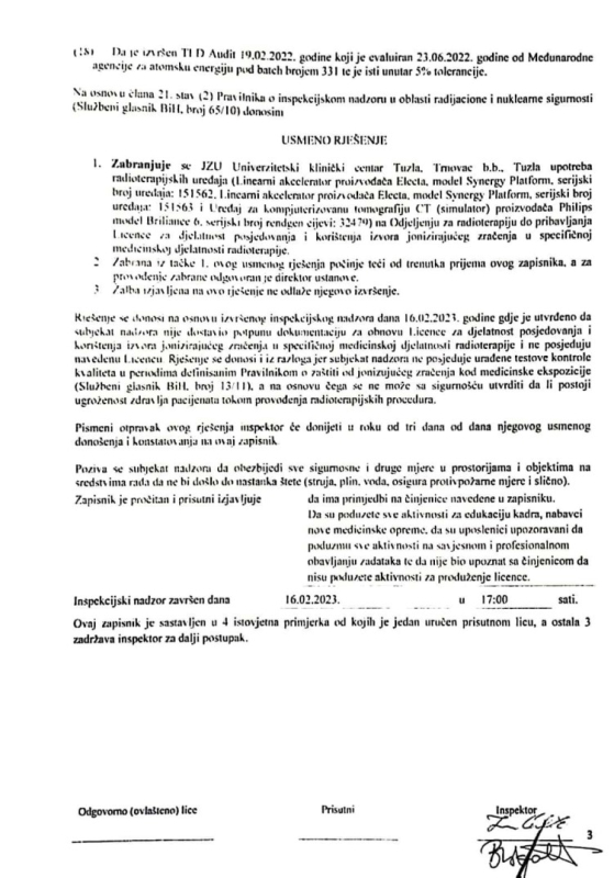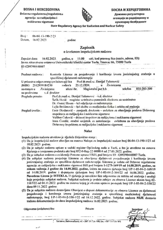 U toj bolnici od februara 2023. godine ne rade aparati za zračenje koje je kod najvećeg broja onkoloških pacijenata nezaobilazna faza liječenja. Državna regulatorna agencija za radijacijsku i nuklearnu sigurnost početkom 2023. godine je izvršila inspekcijski nadzor i utvrdila da je UKC-u Tuzla 14.8.2022. godine istekla licenca za obavljanje djelatnosti posjedovanje i korištenje izvora joizirajućeg zračenja za specifičnu djelatnost radijoterapije. UKC Tuzla je podnio zahtjev za obnovu licence 4.11.2022. godine, otvoren je upravni postupak, ali do ponovnog inspekcijskog nadzora Državna regulatorna agecija za radijacijsku i nuklearnu sigurnost nije dobila tražena dokumenta i nije obnovila licencu i UKC Tuzla zabranila korištenje uređaja za zračenje.