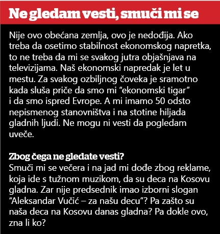 BOŽOVIĆ: Trpim, kao i svi normalni ljudi koji vide šta nam se dešava. Običan čovek je isključen iz svega, nije mu omogućen bilo kakav otpor. Ne postoji voks populis, postoji voks unutaris. Sad se na pritisak Evrope otkriva neki kriminal koji je ovde bio prisutan deset godina. Kao, da nije bilo Vulina mi ne bismo znali za postojanje tih grupa!? Krili su, kao što su svojevremeno srušili kuću u Šilerovoj da bi uništili mnoge tragove o sprezi kriminala i vlasti. Doprli smo i do Kolumbije, čuveniji smo tamo po kriminalu nego po Novaku Đokoviću, Dragoslavu Šekularcu ili Nikoli Jokiću.