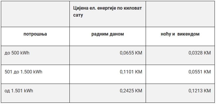 Kako je pojasnio, prema usvojenoj odluci o tarifnim stavovima za javno snabdijevanje električnom energijom u Srpskoj, građani koji mjesečno potroše do 500 kilovata električne energije od 1. januara naredne godine jedan kilovat plaćaće po cijeni od 0,0655 maraka, a u noćnim satima i vikendom utrošena struja će im se obračunavati po duplo manjoj tarifi – 0,0328 maraka. Domaćinstvima koja utroše više od 500, a do 1.500 kilovata struja će se obračunavati po cijeni od 0,11, odnosno 0,551, dok će onima koji “prekrdaše” (više od 1.500 kilovata) skupa struja biti 0,2425, a takozvana jeftina tokom noći i vikendom 0,1213 maraka po jednom utrošenom kilovatu.