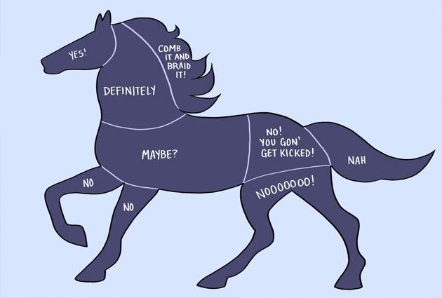 Na dijagramima su navedene zone koje ljubimci smatraju nepoželjnim za češkanje. Tako će se maca i jež najčešće naljutiti ako pokušate da ih mazite po stomaku, a konju se neće dopasti ideja da ga mazite po zadnjim nogama.