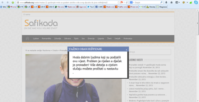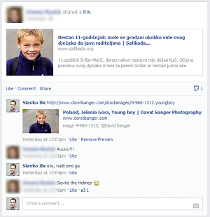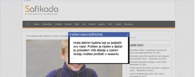 Pre nekoliko dana mi je pažnju na Facebooku privuklo intenzivno deljenje vesti o 11-godišnjem dečaku koji je navodno nestao prilikom povratka iz škole. Slika dečaka mi je odmah "upala u oči" jer je delovala previše "sterilno", ličila je na stock fotografiju sa nekog od sajtova za njihovu distribuciju. Pored toga, pop-up je "agresivno" (čak i nakon kliktanja na X) zahtevao da se vest proširi dalje kako bi što više ljudi čulo za nju.