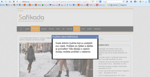 1. Najpre je nekoliko minuta nakon mog maila uskraćen pristup spornom tekstu koji je krao lajkove. Pristup sajtu je bio moguć, sajt do teksta je i dalje postojao ali se klikom na njega stizalo na naslovnu stranu. Akcija sa "žetvom" lajkova je premeštena na novi tekst o "goloj čistačici snega" (ali je poruka o dečaku i dalje ostala ista).