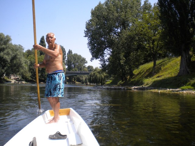 I dok provjeravam foto-aparate (valja puno toga zabilježiti), pogled preko ograde bašte „konstatuje“ da se približava Ibrahim Kršlak-Krle, u čamcu „Castra“. Prije nego što ću se sjetiti da pitam „Krle može li do Zelenog mosta“, njegov pogled sve govori: Ulazi….