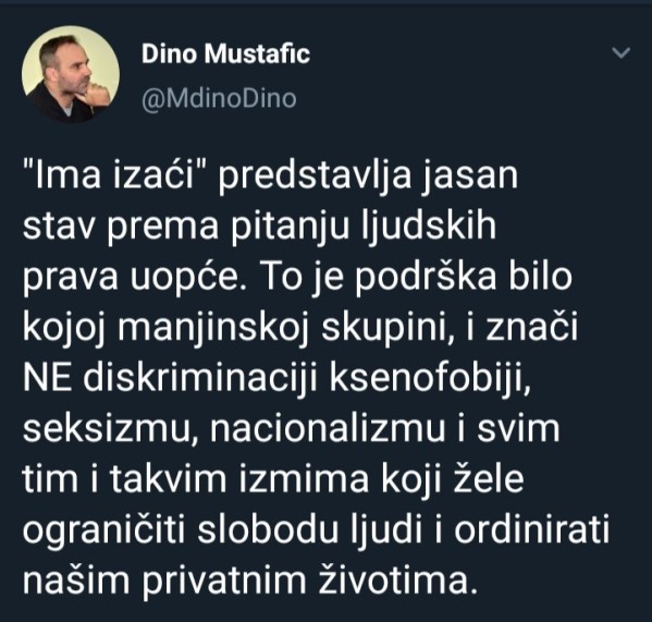 U čemu leži važnost održavanja povorke napisao je na svom Twitter profilu bh. reditelj Dino Mustafić ističući kako je to predstavlja „ne“ svakom obliku diskriminacije.
