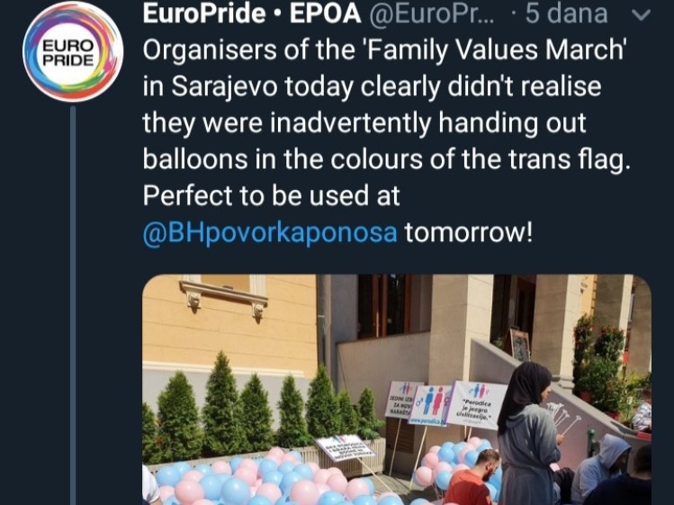 Budući da su učesnici skupa „Dan tradicionalne porodice“ šetajući nosili balone i zastavice u roza i plavim bojama, želeći tako istaći da samo i isključivo žena i muškarac čine zajednicu, prema objavljenom tvitu udurženja Pride organizacija Evrope (EuroPride – EPOA) navedene boje simbolizuju transrodnu zastavu pa su isti rekviziti mogli poslužiti i na prvoj Bh. povorci ponosa.