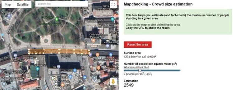 Portal raskrinkavanje.ba se zabavio upravo ovom viješću te u svom tekstu od 10.9. naveo „ukoliko se u aplikaciju mapchecking.com unese gustina od dvije osobe po metru kvadratnom za prostor koji je označen na slici, broj učesnika/ca povorke procjenjuje se na 2549 osoba. Ponovo, radi se o donjoj granici procjene, to jest o minimalnom procijenjenom broju učesnika/ca.“