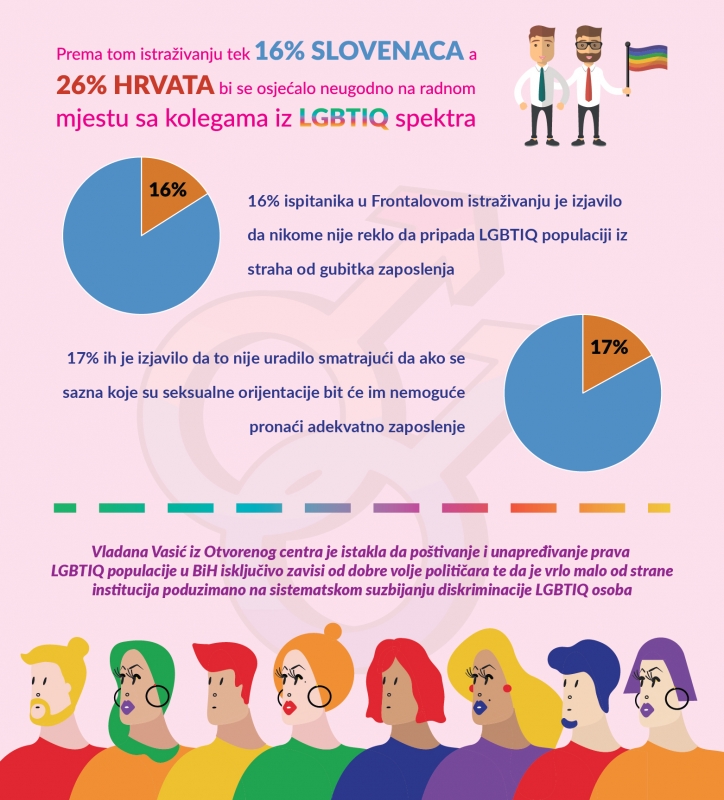 Poređenja radi, 16% ispitanika u Frontalovom istraživanju je izjavilo da nije nikome reklo da pripada LGBTIQ populaciji iz straha od gubitka zaposlenja, dok ih čak 17% to nije uradilo smatrajući da će im,  ako se sazna koje su seksualne orijentacije, biti nemoguće pronaći adekvatno zaposlenje.