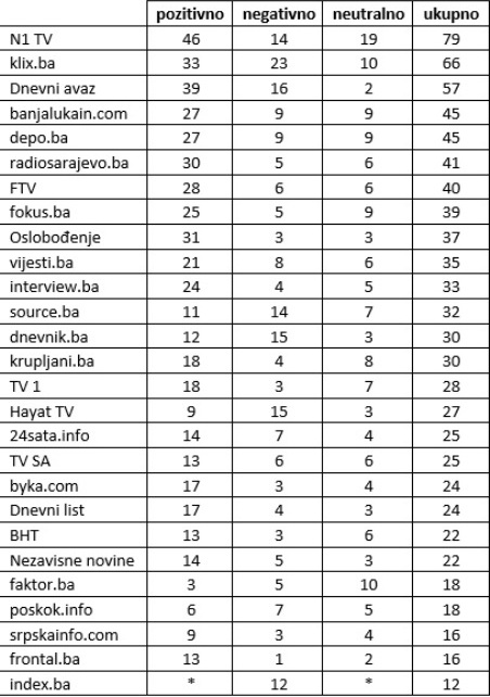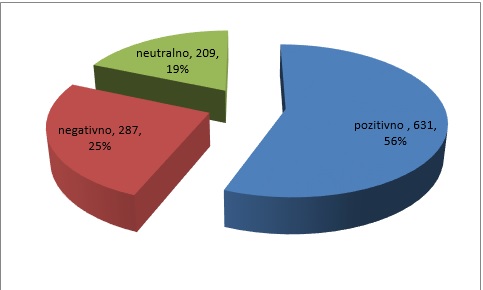 Ukupno je zabilježena 631 pozitivno vrednovana objava, odnosno 56%, zatim slijede negativne – 287 objava ili 25% i neutralne – 209 objava ili 19%.