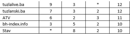 Večernji list, Al Jazeera, Face TV, OBN, Nova BH, TV Slon i internet portali bljesak.info, dnevno.ba, hms.ba, livno.com, mostarski.ba, narod.ba, pogled.ba, regional.ba, slobodna-bosna.ba, tip.ba su mediji u kojima je takođe zabilježeno manje od 10 objava o Povorci ponosa.