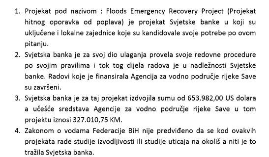“Zakonom o vodama Federacije BIH nije predviđeno da se za takve projekte radi studija izvodljivosti ili studija uticaja na životnu sredinu”, pišu u odgovoru na naša pitanja iz Agencije za vodno područje rijeke Save.