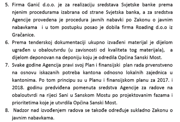 Prema njihovim navodima, radovi koje je agencija finansirala sa 327.000 KM su završeni, dok je Svjetska banka “za kompletan projekat izdvojila oko 654.000 dolara”. Pojašnjavaju da su oni (Svjetska banka) kroz svoje procedure za izvođača radova izabrali firmu Ganić d.o.o, a agencija firmu Roading d.o.o. iz Gračanice. Na pitanje ko nadzire radove, iz agencije nejasno odgovaraju da se i to “bira u skladu sa Zakonom o javnim nabavkama”.