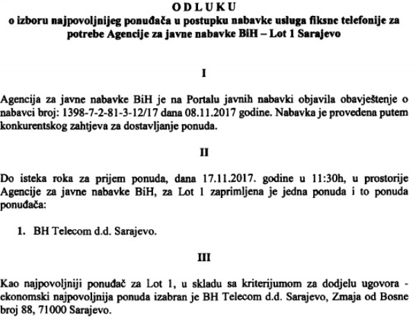 „Ugovorni organ je sam dao odgovor na pitanje. Obavezni si bili ispitati tržište, što očigledno nisu uradili, nego su samo tražili ponudu jednog ponuđača. Da su ispitali tržište vidjeli bi da su drugi ponuđači povoljniji i tražili bi više ponuda. Napominjemo da je BH Telekom izuzet iz primjene ZJN-a upravo iz razloga što je ova oblast izložena konkurenciji, te je svakako neprimjereno da jedna institucija koja treba da bude uzor svim drugim institucijama na ovakav način zloupotrebljava ZJN, na štetu javnih sredstava“, smatra Vukajlović.