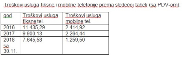 Troškovi mobilnih telefona Službe za reviziju za decembar 2018. godine, iznosili su ukupno 119,52 KM, dok su troškovi fiksnih telefona kancelarije u Banjaluci za isti mjesec 2018. godine iznosili 439,56 KM, a za kancelariju u Bijeljini 200,17 KM, što ukupno iznosi 759,25 KM (bez usluga interneta). To bi značilo da ukupni godišnji troškovi fiksne i mobilne telefonije dvije kancelarije Glavne službe za reviziju iznose više od 6,000 KM, odnosno više od 9.000 KM, za šta je po zakonu neophodno raspisati tender o nabavci tih usluga.