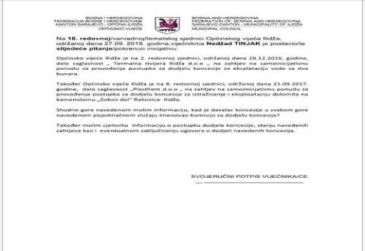 Kao vijećnik ne, samo kao građanin koji se informisao iz medija, kroz svoja istraživanja i po sjećanju, ukoliko je davanje saglasnosti za korištenje određenog koncesionog dobra bilo na nekoj od sjednica vijeća. U tome i jeste problem, te sam zbog toga predložio zaključak vijeća po kojem od nadležnog Ministarstva privrede KS tražimo spisak svih ilidžanskih koncesionih dobara na kojima se vrši eksploatacija, te godišnji plan eksploatacije koji su po Zakonu o koncesijama bili dužni napraviti. Takav zaključak je prije dvije godine podržan od strane kolegica i kolega iz OV Ilidža, ali informacije koje smo tražili do danas nismo dobili. Taj zaključak kasnije je na sjednicama kolegija pretvoren u molbu, pa u apel, pa u urgenciju, međutim, nikad nismo dobili tražene informacije. Zbog toga, Klub vijećnika SDP BiH u OV Ilidža još prije godinu dana je poručio da neće podržati nijedan zahtjev za davanje saglasnosti za korištenje koncesionog dobra dok ne dobijemo tražene informacije – što podrazumijeva: godišnji plan korištenja koncesionih dobara u KS, lokacije koncesionih dobara, nazive firmi koje koriste svako od pojedinačnih dobara, finansijske detalje ugovora, te historijat izmirivanja obaveza prema KS i Opštini Ilidža.