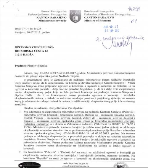 S obzirom da je općina Ilidža, jedna od najbogatijih općina u cijeloj BiH kad su u pitanju mineralne i ljekovite vode, a kao što je već navedeno u inspekcijskom odgovoru, da se na njenoj teritoriji nalaze tri od četiri aktivne eksploatacijske radnje, bilo je sasvim prirodno da ona bude i u žiži ovog istraživačkog teksta. Općinsko vijeće, zajedno sa načelnikom, pripada Stranci demokratske akcije, što uz činjenicu da je prethodni ministar Šabić iz iste stranke, vama kao poduzetniku odmah daje mogućnost, da putem direktne pogodbe i općinskog vijeća, vršite ekploataciju na spomenutoj teritoriji. No, da je situacija ipak malo drugačija, saznali smo zahvaljujući općinskom vijećniku iz Socijaldemokratske partije, gospodinu Nedžadu Tinjku, koji je nakon svog privatnog istraživanja, odlučio poslati pitanje tadašnjem ministru Šabiću, o stanju eksploatacijskih polja na području općine Ilidža.