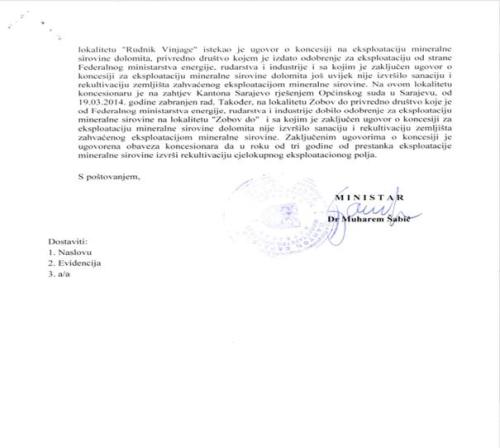 Odgovor koji je dobio od tadašnjeg ministra Šabića je veoma zanimljiv. Toliko je, naime, zanimljiv da bi meni lično bilo interesantno gledati u kantonalnom sudu, kako gospodin Šabić objašnjava činjenicu, da firma koja vrši eksploatacijsku radnju, nema potpisan ugovor sa pravnim davaocem tog prava. Odnosno, kako je moguće da jedna firma, koja ima potpisan ugovor sa višim nivoom vlasti (koji nije vlasnik dodjela prava), vrši eksploataciju bez odobrenja nižeg nivoa vlasti (koji je vlasnik dodjele prava, odnosno daje pravo na eksploataciju)?