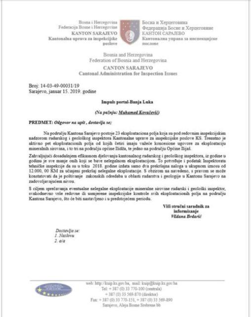 Da bih kao autor teksta izbjegao špekulacije ove vrste, uputio sam zvanična pitanja zvaničnim institucijama zaduženim za nadzor i odobrenje koncesijskih dozvola u Kantonu Sarajevo. Odgovor sam jedino dobio od Kantonalne inspekcije, službe koja u okviru svojih mogućnosti očigledno radi vrlo dobar posao. Na moje pitanje o statističkim parametrima o broju aktivnih eksploatacijskih polja, kao i broju poduzetih kaznenih prijava, dobio sam odgovor da su u Kantonu Sarajevo za proteklu 2018. godinu bila aktivna tek četiri od 23 eksploatacijska polja, a da je novčani iznos po izrečenim kaznama za „nepravilno“ korištenje resursa 12.000 KM. Zanimljivo bi bilo vidjeti kakve bi statističke podatke dobili, u slučaju da umjesto jednog geološkog inspektora, inspekcija posjeduje, recimo, četiri ili više. Tek tada, uz adekvatnu tehničku opremljenost, sigurno bi poštivanje zakona bilo na izvrsnom nivou. Naravno, te stvari nisu u nadležnosti inspekcije, nego njenog poslodavca vlade kantona, odnosno svih vlada od 2011. godine, kada je zakon donesen, i kada je trebalo misliti i na te stvari. Ipak, korekcija je napravljena 2016. godine, kada je Vlada po hitnom postupku usvojila određene amadmane na Zakon o koncesiji, nažalost, i dalje bez prave podrške instituciji Kantonalne inspekcije.