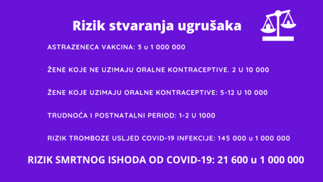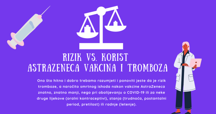 Ono što hitno i dobro trebamo razumjeti i ponoviti jeste da je rizik tromboze, a naročito smrtnog ishoda nakon vakcine AstraZeneca znatno, znatno manji, nego pri obolijevanju o COVID-19 ili za neke druge lijekove (oralni kontraceptivi), stanja (trudnoća, postnatalni period, pretilost) ili radnje (letenje).