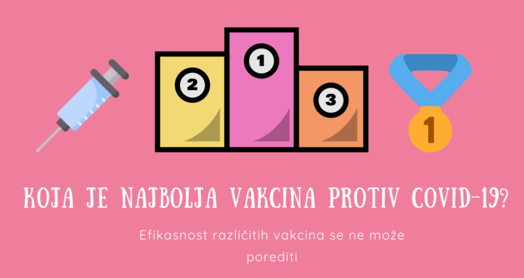 Ne trebate gledati podatke o efikasnosti vakcina jednostavno, neke su imale drugačiji dizajn studije, pa su zapravo podaci o efikasnosti neusporedivi. Različitu efikasnost su vakcine imale i u ovisnosti od područja gdje su ispitivane te perioda kada su ispitivane – da li je tada bio na snazi lockdown i bila smanjena transmisija ili se popustilo s mjerama. Jednostavno, različite vakcine nisu bile testirane u istim uslovima.