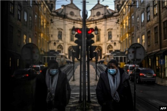 A woman wearing a face mask is reflected in a shop window while walking in Lisbon as Portugal entered a fresh lockdown over a surge in coronavirus cases.