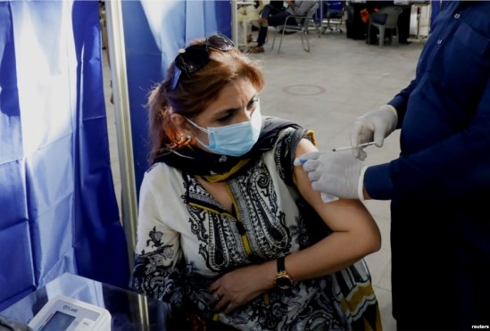 A resident receives a dose of a coronavirus disease (COVID-19) vaccine, at a vaccination center in Karachi, Pakistan April 2, 2021. REUTERS/Akhtar Soomro