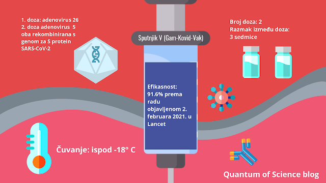 Ruska vakcina Sputnjik V/Sputnik V Instituta Gamaleja bazirana na adenovirusnom vektoru s heterogenim dizajnom ima efikasnost od 91.6% nakon 2 doze. Štiti 100% od komplikacija i teške slike COVID-19 te smrtnog ishoda.