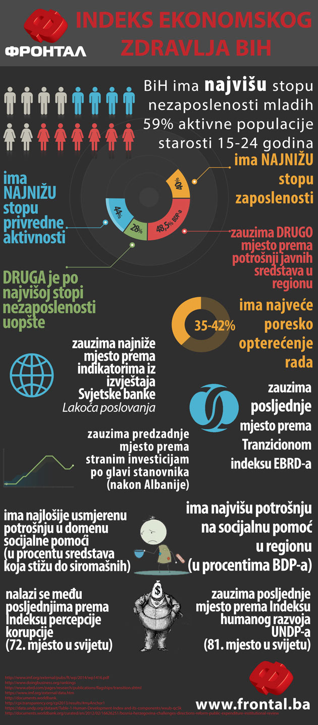 Na osnovu podataka predstavljenih u publikaciji „Boosting Job Growth in the Western Balkans“ (Kako podstaći otvaranje novih radnih mjesta na zapadnom Balkanu), radni dokument MMF-a objavljene u januaru 2014. BiH ima najnižu stopu privredne aktivnosti, najnižu stopu zaposlenosti ali i najveće poresko opterećenje rada. Osim toga, mnoge druge analize pokazuju poraznu sliku ekonomskog stanja.