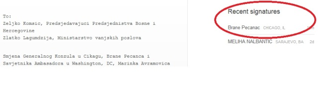 „U ime istine o zločinima agresije i genocida i pravde za žrtve tih zločina, zahtijevamo od Vas, da hitno poduzmete odgovarajuće mjere da se ove `diplomate` sankcionišu i sklone s časnih pozicija diplomatskih predstavnika Bosne i Hercegovine. Pozivamo vas da se stavite u službu istine i pravde, tako što će prihvatiti ovaj poziv patriotskih organizacija i smjenom takozvanih bosanskohercegovačkih diplomata dati do znanja da vam je stalo do odbrane i jačanja države Bosne i Heregovine.“