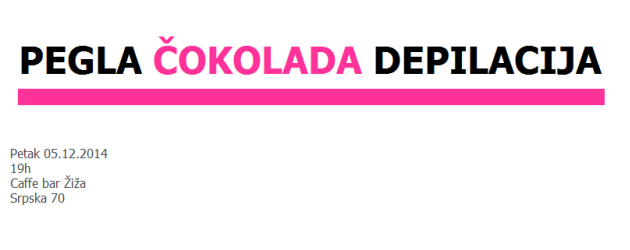 Izložba „Pegla. Čokolada. Depilacija.“ će se održati u kafiću Žiža, sutra, 5.12.2014. s početkom u 19 časova.