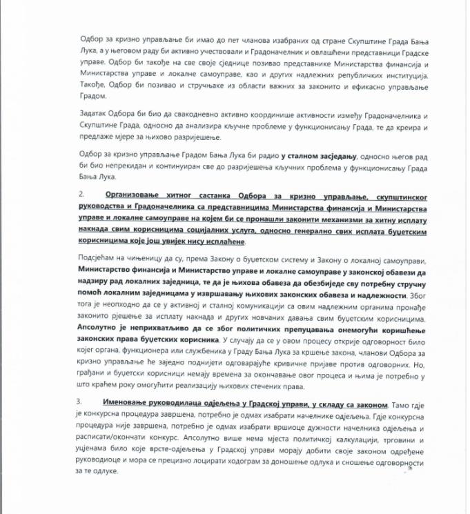 – Хитно проналажење законског рјешења у сарадњи са надлежним органима како би се исплатила сва доспјела новчана давања свим буџетским корисницима, оснивање одбора за кризно управљање, именовање руководилаца свих одјељења у Градској управи, смјена неспособних рукоковдстава градских установа и предузећа, као и усвајање Урбанистичког плана и престанак деценијског тајкунског грађења-основне су предложене мјере.