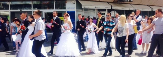 Mladenci su nakon građanskog vjenčanja prošetali centrom Banjaluke, a mlade su ispred Gradske uprave bacile bukete.