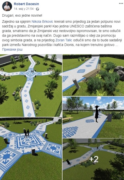 "Kao jedina UNESCO zaštićena baština grada, smatramo da je Zmijanski vez nedovoljno ispromovisan, te smo odlučili da ga predstavimo na ovaj način. Dugo sam razmišljao o ideji za promociju ovog simbola grada, a na prijedlog Zorana Talića odlučili smo da to bude sadašnji park između Narodnog pozorišta i kafića Dionis, na kojem trenutno gotovo da nema ništa. Vodili smo se tim da ne diramo samu veličinu parka, kao ni postojeću živu ogradu, i da uz mali budžet pokušamo kreirati nešto novo i zanimljivo. Staze u parku bi bile popločane kamenim kockama sa motivima Zmijanjskog veza", napisao je Robert na svom fb profilu.