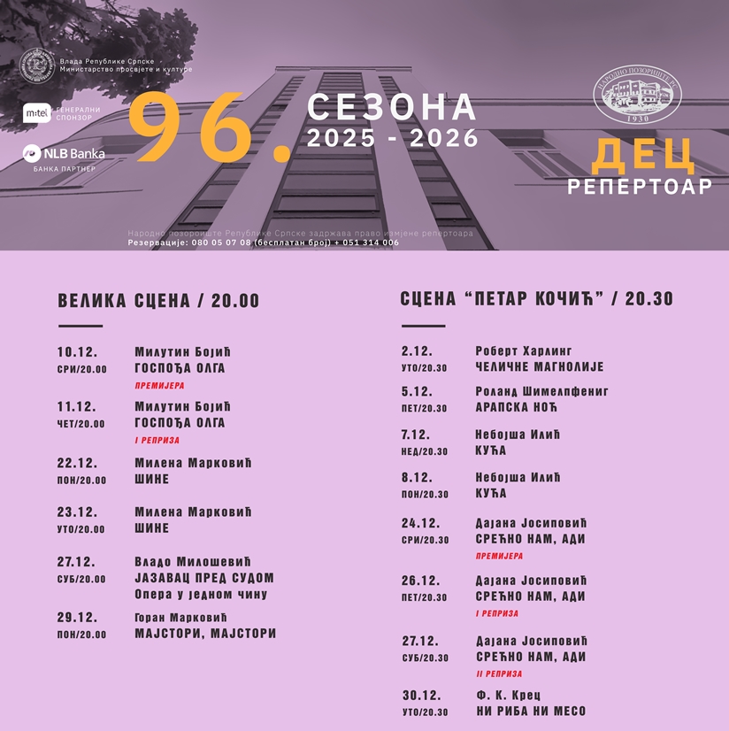 Нови репертоар Народног позоришта Републике Српске за децембар доноси разноврстан избор представа које не треба пропустити – погледајте шта вас очекује на сцени.