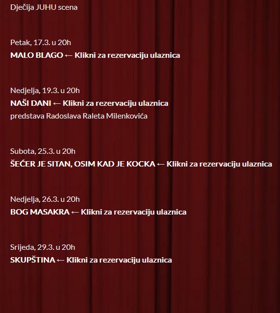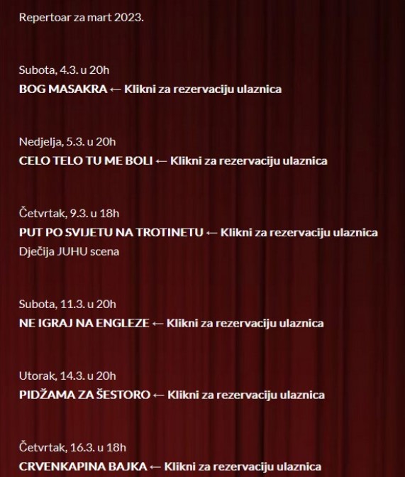 Kultura Manje od min. min. Pogledajte repertoar Gradskog pozorišta Jazavac za mart mjesec 01.03.2023 FacebookTwitterPinterestWhatsApp Frontal Popularno ove nedelje Region У Загребу обиљежавање 34 године од убиства породице Зец 07.12.2025 0 У Загребу ће данас бити обиљежене 34 године од... Svijet Mask pozvao na ukidanje Evropske unije 07.12.2025 0 Američki milijarder Ilon Mask pozvao je na ukidanje Evropske... Vijesti LEAD na konferenciji ŽENE I TOČKA 10.0: Održiva budućnost ispisana ženskim potpisom 06.12.2025 0 Predstavljen regionalni kompas, ESG Coach Ovogodišnja, 10. jubilarna konferencija HGK... Sport Denver pobijedio Atlantu, Јokić postigao 40 poena na meču 06.12.2025 0 Košarkaši Denver nagetsa pobijedili su na gostovanju ekipu Atlanta... Kultura Zlato za bijeljinsku Muzičku školu na festivalu u Gracu 06.12.2025 0 Učenici Muzičke škole "Kornelije Stanković" iz Bijeljine ostvarili su... Teme Region У Загребу обиљежавање 34 године од убиства породице Зец 0 У Загребу ће данас бити обиљежене 34 године од... Svijet Mask pozvao na ukidanje Evropske unije 0 Američki milijarder Ilon Mask pozvao je na ukidanje Evropske... Vijesti LEAD na konferenciji ŽENE I TOČKA 10.0: Održiva budućnost ispisana ženskim potpisom 0 Predstavljen regionalni kompas, ESG Coach Ovogodišnja, 10. jubilarna konferencija HGK... Sport Denver pobijedio Atlantu, Јokić postigao 40 poena na meču 0 Košarkaši Denver nagetsa pobijedili su na gostovanju ekipu Atlanta... Kultura Zlato za bijeljinsku Muzičku školu na festivalu u Gracu 0 Učenici Muzičke škole "Kornelije Stanković" iz Bijeljine ostvarili su... Svijet Merc: Sve zemlje moraju da snose isti rizik kada je u pitanju zamrznuta ruska imovina 0 Njemački kancelar Fridrih Merc izjavio je, nakon sinoćnjeg razgovora... Republika Srpska U decembru dvije penzije u Republici Srpskoj 0 Ministarstvo finansija Republike Srpske informiše javnost da će u... Svijet Orban: Narednih dana se odlučuje da li će se rat iz Ukrajine proširiti na Evropu; Moguća tužba protiv EK 0 Narednih dana će se odlučiti da li će se... Povezani članci Zlato za bijeljinsku Muzičku školu na festivalu u Gracu Kultura 06.12.2025 Pogledajte repertoar Gradskog pozorišta “Јazavac” Kultura 30.11.2025 Репертоар Народног позоришта Републике Српске за децембар (ФОТО) Kultura 28.11.2025 Autoportret Fride Kalo prodat za 54,7 miliona dolara (FOTO/VIDEO) Kultura 21.11.2025 Филмoви "Џo" и "Eвo гoлa" у Чикагу на 12. Фестивалу српског филма Kultura 17.11.2025 Popularne kategorije VijestiSvijetPolitikaRepublika SrpskaSportRegion Previous articleVučić: Nikada neću pristati na priznanje i ulazak Kosova u UN, o svemu ostalom možemo da pregovaramoNext articleDirektorica Centra za socijalni rad Srbac zaposlena i u Srbiji kao savjetnik u RZSZ