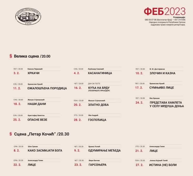 Из Народног позориште Републике Српске напомињу да задржавају право измјене репертоара!