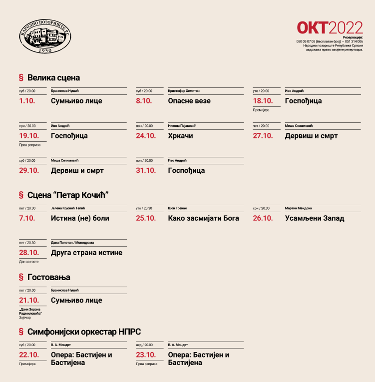 Погледајте репертоар Народног позоришта Републике Српске за мјесец октобар