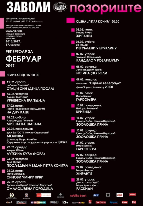 Kultura Manje od min. min. Pogledajte repertoar NPRS za februar 25.01.2017 FacebookTwitterPinterestWhatsApp Popularno ove nedelje BiH Vazduh nezdrav u Tuzli, Banjaluci, Doboju i Lukavcu 11.12.2025 0 Vazduh je jutros nezdrav u Tuzli, Banjaluci, Doboju i... BiH Kapidžić tvrdi da je planirana izgradnja garaže u krugu Stare pravoslavne crkve: To će zagušiti Baščaršiju (VIDEO) 11.12.2025 0 Zastupnik u Skupštini Kantona Sarajevo i arhitekta Faruk Kapidžić... Blog Da li je samo Sarajevo (pod kontolom Armije RBiH) tokom građanskog rata bilo opkoljeno i okruženo? 10.12.2025 0 Svađaju se Bošnjak i Srbin u mom prisustvu i... BiH Krnjić ponovo oborio usvajanje Pravilnika za novi granični prelaz Gradiška 10.12.2025 0 Člana Upravnog odbora UIO Zijad Krnjić ponovo je oborio... BiH Vazduh nezdrav u šest gradova 10.12.2025 0 U Banjaluci, Tuzli, Brodu, Prijedoru, Lukavcu i Doboju vazduh... Teme BiH Vazduh nezdrav u Tuzli, Banjaluci, Doboju i Lukavcu 0 Vazduh je jutros nezdrav u Tuzli, Banjaluci, Doboju i... BiH Kapidžić tvrdi da je planirana izgradnja garaže u krugu Stare pravoslavne crkve: To će zagušiti Baščaršiju (VIDEO) 0 Zastupnik u Skupštini Kantona Sarajevo i arhitekta Faruk Kapidžić... Blog Da li je samo Sarajevo (pod kontolom Armije RBiH) tokom građanskog rata bilo opkoljeno i okruženo? 0 Svađaju se Bošnjak i Srbin u mom prisustvu i... BiH Krnjić ponovo oborio usvajanje Pravilnika za novi granični prelaz Gradiška 0 Člana Upravnog odbora UIO Zijad Krnjić ponovo je oborio... BiH Vazduh nezdrav u šest gradova 0 U Banjaluci, Tuzli, Brodu, Prijedoru, Lukavcu i Doboju vazduh... Svijet Zelenski priznao realnost oko Krima i članstva u NATO-u. “Nemamo snage” 0 Ukrajina ima realističan pristup budućem članstvu u NATO-u i... Banja Luka Dodik o regulacionom planu “Malta 1” u Banjaluci 0 Podržavam zahtjeve građana banjalučkog naselja Rosulje da se ne... BiH Čović: Federalizam obezbjeđuje jednak glas sva tri konstitutivna naroda 0 Predsjednik HDZ-a BiH Dragan Čović izjavio je sinoć u... Povezani članci „Госпођа Олга“ 10. децембра премијерно у Народном позоришту Републике Српске Kultura 08.12.2025 Zlato za bijeljinsku Muzičku školu na festivalu u Gracu Kultura 06.12.2025 Pogledajte repertoar Gradskog pozorišta “Јazavac” Kultura 30.11.2025 Репертоар Народног позоришта Републике Српске за децембар (ФОТО) Kultura 28.11.2025 Autoportret Fride Kalo prodat za 54,7 miliona dolara (FOTO/VIDEO) Kultura 21.11.2025 Popularne kategorije VijestiSvijetPolitikaRepublika SrpskaSportRegion Previous articleMesić se izvinio zbog JasenovcaNext articleSNSD: Uskoro nova apelacija Ustavnom sudu o "danu državnosti" BiH