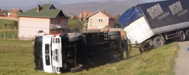 Камион регистарских ознака Сјенице заустављен је јуче на дионици пута Малишево – Орлате у Метохији, а потом је преврнут поред пута.
