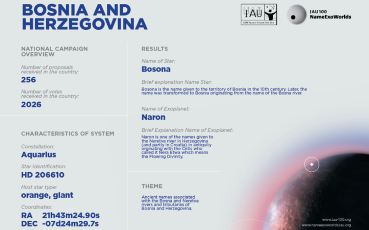 U okviru proslave stogodišnjice Međunarodne astronomske unije (IAU– International Astronomical Union) organizovano je svjetsko takmičenje „IAU100 NameExoWorlds“ odnosno „Predložite ime egzo planetarnom sistemu". Inače, proslava se odvija pod sloganom „Ispod jednog neba“. Ovim je svakoj zainteresiranoj zemlji na svijetu omogućeno da imenuje odabranu egzoplanetu i zvijezdu oko koje se okreće. Odazvalo se 122 države, uključujući i Bosnu i Hercegovinu.