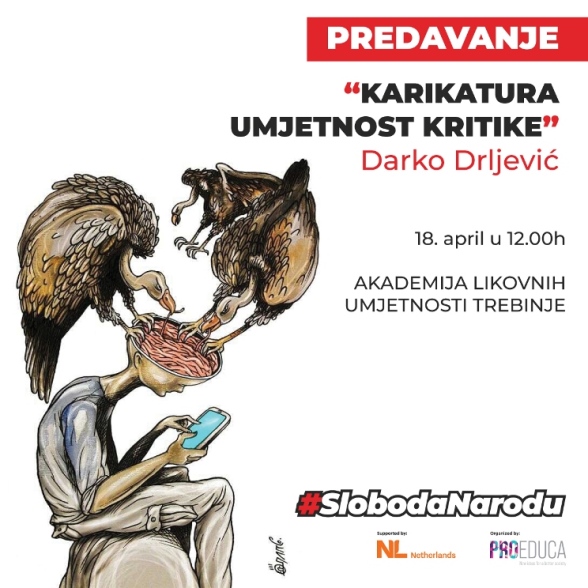 18.04. u 12.00 časova u Akademiji likovnih umjetnosti u Trebinju posjetioci će moći da prisustvuju predavanju "Karikatura, umjetnost kritike", karikaturiste Darka Drljevića.