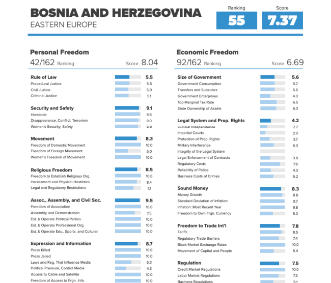 Kada je riječ o Bosni i Hercegovini, naša zemlja se nalazi na 55. mjestu od ukupno 162 posmatrane zemlje. Po pitanju ličnih sloboda, Bosna i Hercegovina se nalazi na 42. mjestu (ocjena 8.04), a ekonomskih sloboda na 92. mjestu (ocjena 6.69). U okviru kategorije lične slobode, najbolje ocjene, ostvarene su za indikator "Udruživanje i civilno društvo" (9.5), a najslabije ocjene za indikator "Vladavina prava" (5.5). U okviru ekonomskih sloboda, najbolje ocjenjen indikator je onaj koji se odnosi na "Čvrstu valutu" (8.3). Najslabije ocjene ima indikator "Pravni sistem i vlasnička prava" (4.2). U posmatranom regionu Istočna Evropa, gdje spada i Bosna i Hercegovina, najviše slobodne su sljedeće zemlje: Estonija, Češka, Litvanija i Rumunija. Najmanje slobode su Ukrajina, Rusija, Bjelorusija, Moldova i Srbija.