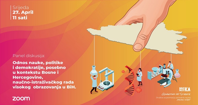 Naučno istraživački razvoj je u Bosni i Hercegovini je na veoma niskom nivou, ulaganja u nauku nikad manja i ispod svakog regionalnog, evropskog i svjetskog prosjeka, politika vlada naukom umjesto da nauka bude društveni korektiv, koji pozitivno utiče na politike i ekonomiju, a broj mladih istraživača je izuzetno nizak jer, ustvari, nemaju kvalitetne uslove za rad. Ovo su samo neki od značajnih problema koji su spomenuti tokom online panel diskusije. Panel na temu odnosa nauke, politike i demokratije, posebno u kontekstu Bosne i Hercegovine, naučno-istraživačkog rada i visokog obrazovanja u BiH, organizovalo je Društvo za promociju prirodnih nauka “Nauka i svijet”, a sudjelovali su uticajni bosanskohercegovački stručnjaci i stručnjakinje, predstavnici i predstavnice medija, nevladinog sektora, te univerzitetski profesori i profesorice iz različitih oblasti.