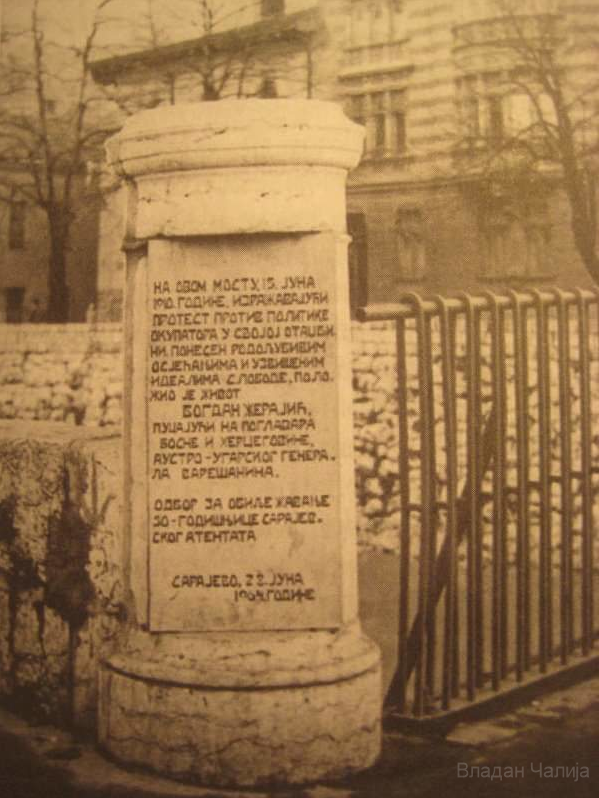 „На овом мосту,15. јуна 1910. године, изражавајући протест против политике окупатора у својој отаџбини, понесен родољубивим осјећањима и узвишеним идеалима слободе, положио је живот БОГДАН ЖЕРАЈИЋ, пуцајући на поглавара Босне и Херцеговине, Аустро-угарског генерала Варешанина“