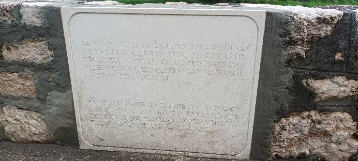 „Sa ovog mjesta 28. juna 1914. godine Nedeljko Čabrinović je izvršio neuspjeli atentat na аustrougarskog prijestolonasljednika Franca Ferdinanda i njegovu suprugu Sofiju“,
