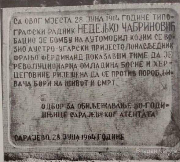 „Са овог мјеста 28. јуна 1914 године типографски радник НЕДЕЉКО ЧАБРИНОВИЋ бацио је бомбу на аутомобил којим се возио аустро-угарски пријестолонасљедник Фрањо Фердинанд показавши тиме да је револуционарна омладина Босне и и Херцеговине ријешена да се против потобљивача бори за живот и смрт“,