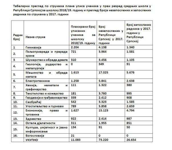 Planom upisa u prve razrede srednjih škola za 2018/2019. godinu predviđena su 11.083 mjesta. U gimnazije je planiran upis 2.204 učenika ili 19,89 odsto, a u srednje stručne i tehničke škole 8.879 učenika ili 80,11 odsto.